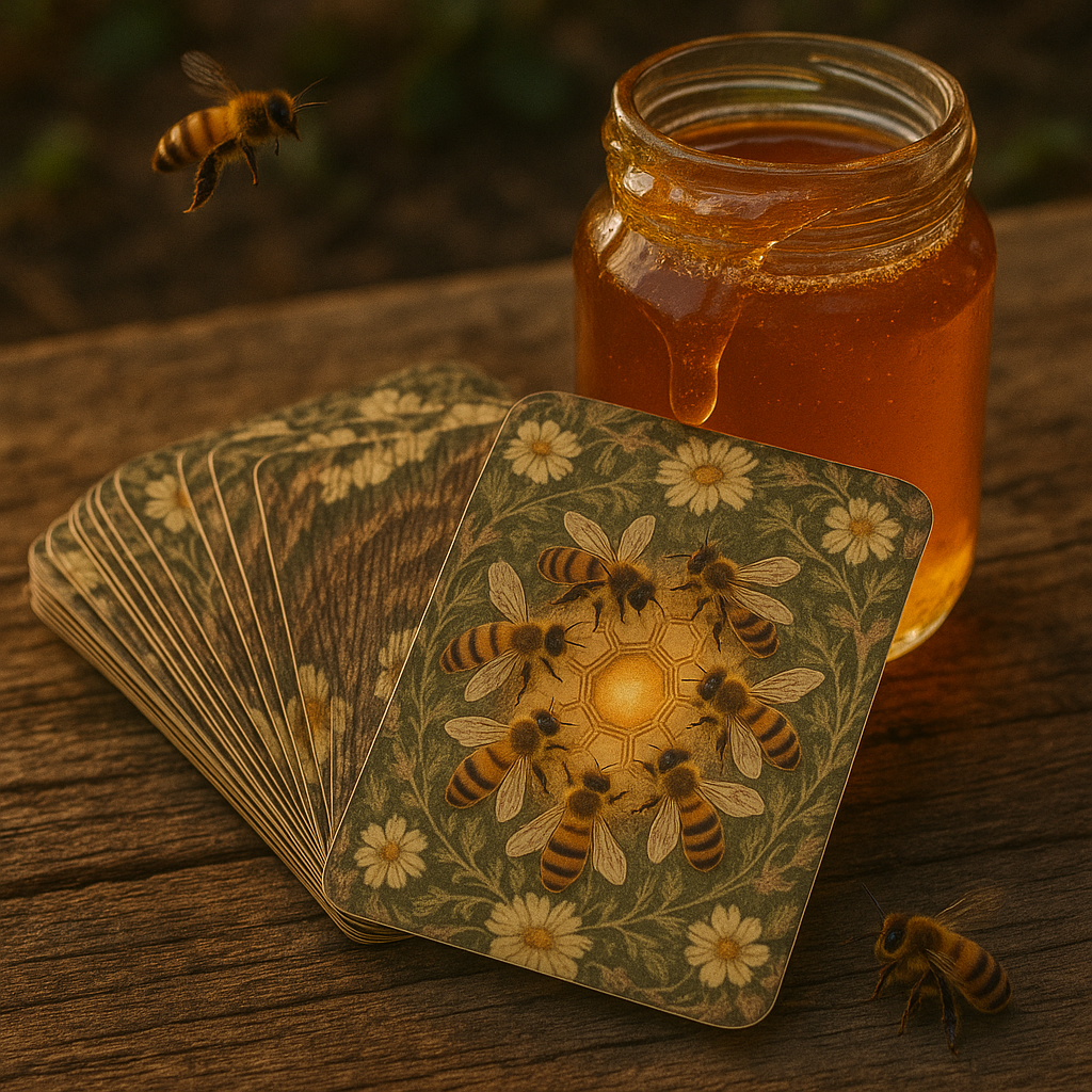 Each deck is locally printed, hand-cut, and laminated, then charged with intention and energy before being wrapped in a fabric pouch for safekeeping. Inside, you’ll find a world where bees serve as messengers between realms, carrying wisdom from the hive to the heart.